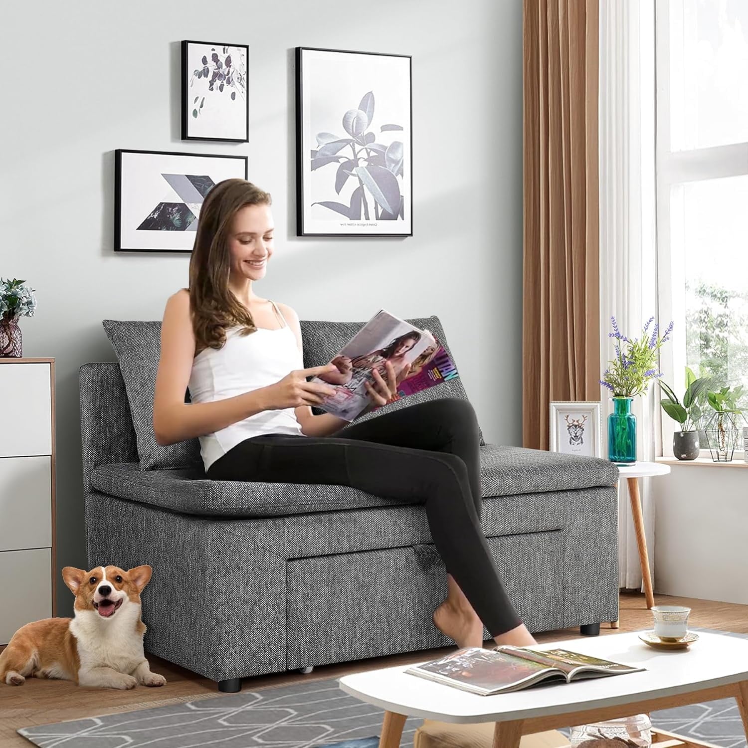 Farmdex Small Loveseat Sofa with Drawer Storage, Linen Fabric 2-Seater Couch for Living Room and Bedroom, 47.2" Compact Couch for Small Spaces, Solid Wood Frame Dark Grey